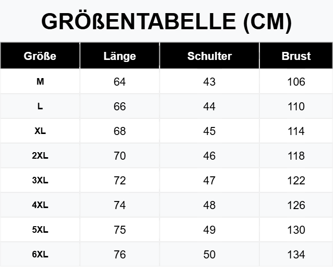 Um die beste Passform zu wählen, empfehlen wir Ihnen, eine Nummer größer zu wählen. Zum Beispiel, wenn Sie normalerweise Größe L tragen, dann empfehlen wir Ihnen, XL zu wählen.